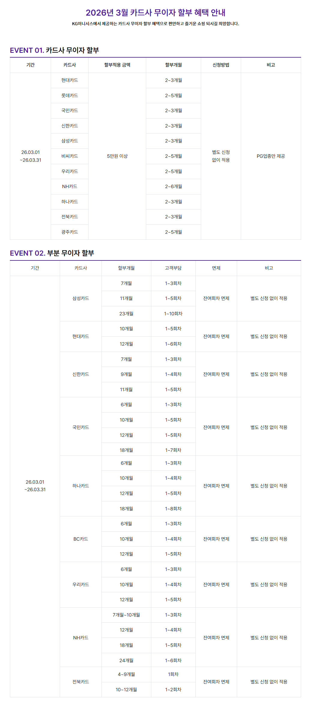 2026년 03월 카드사 무이자 및 부분 무이자 할부 혜택 안내